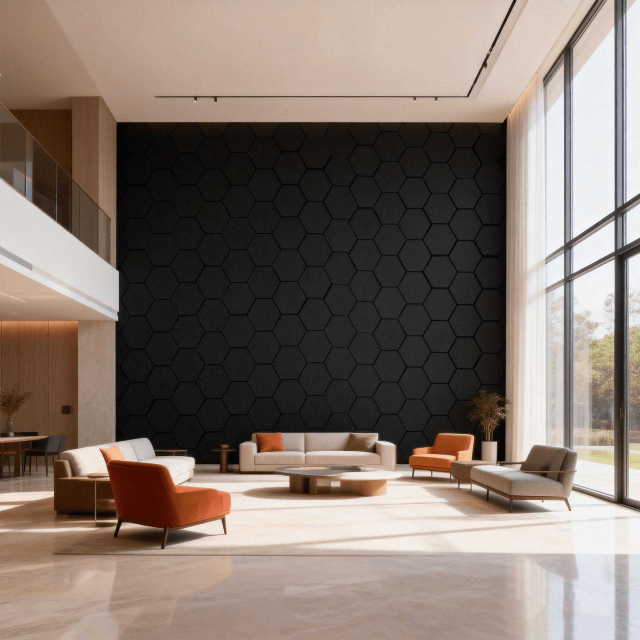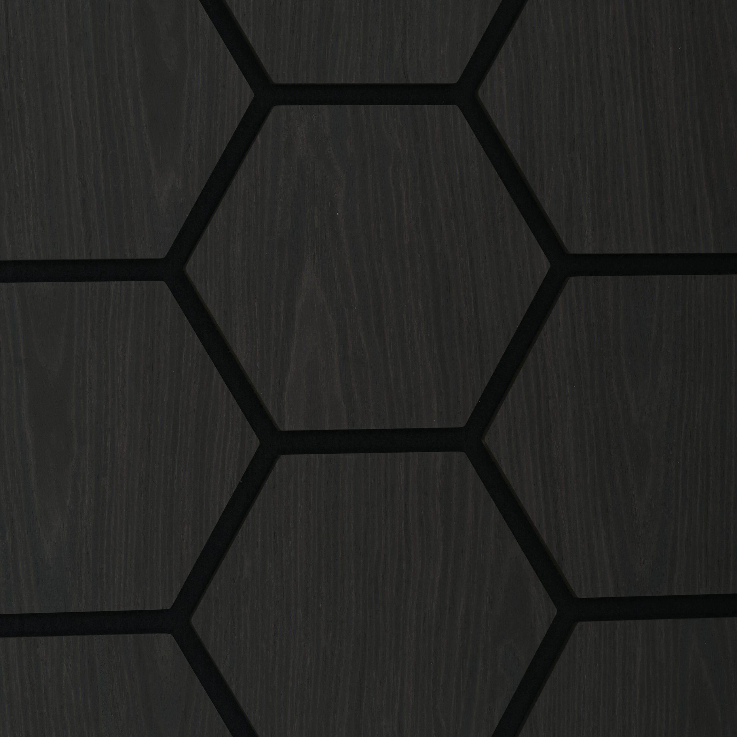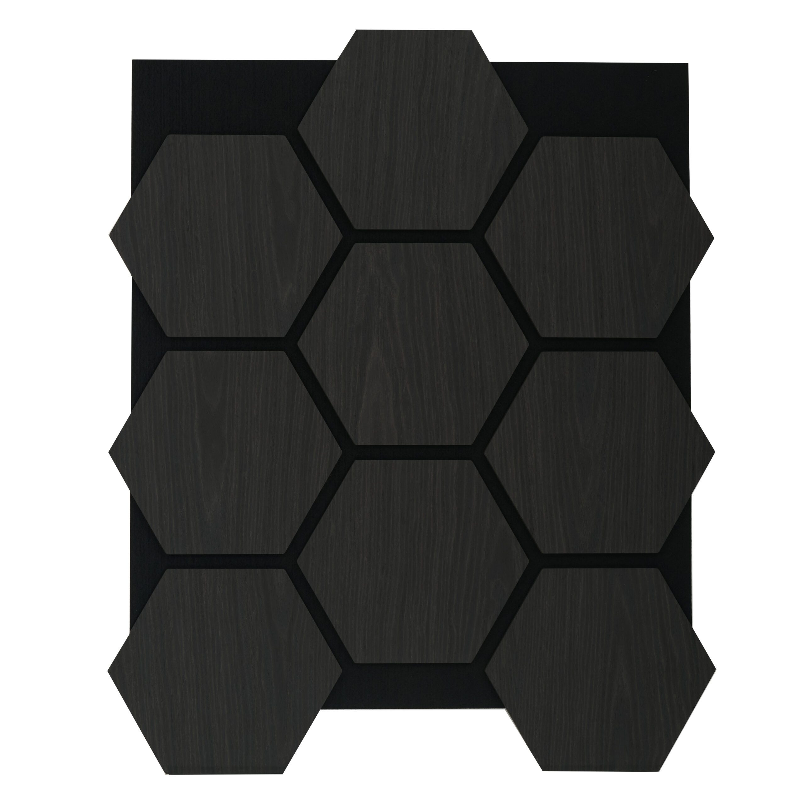 Verleihen Sie Ihren Wänden eine edle, geometrische Struktur. Dieses Akustikpaneel in Eiche Schwarz besteht aus 9 fest montierten Hexagon-Elementen auf einer Trägerplatte. Es kombiniert die natürliche Ausstrahlung von Eichenholz mit einem modernen, tiefschwarzen Finish für ein exklusives Design-Statement.